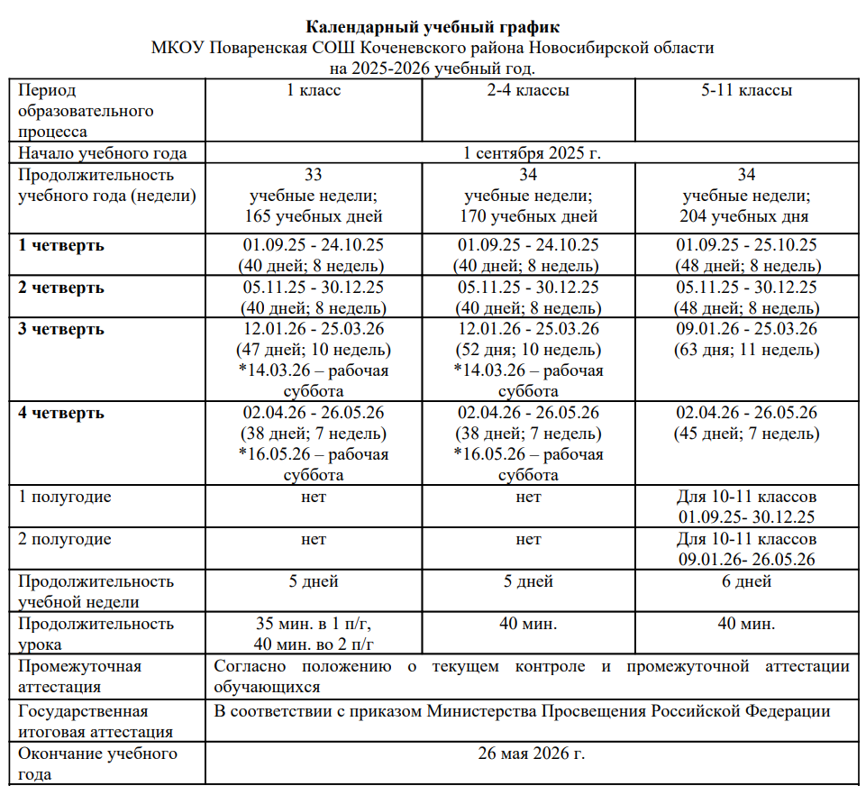 МКОУ Поваренская СОШ осуществляет образовательную деятельность в одну смену