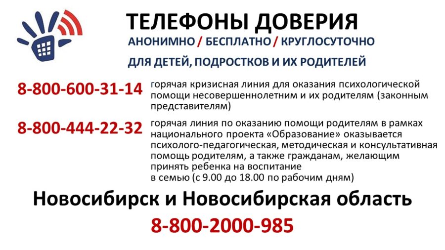 8-800-2000-985 - Телефон доверия для детей и подростков Новосибирской области
